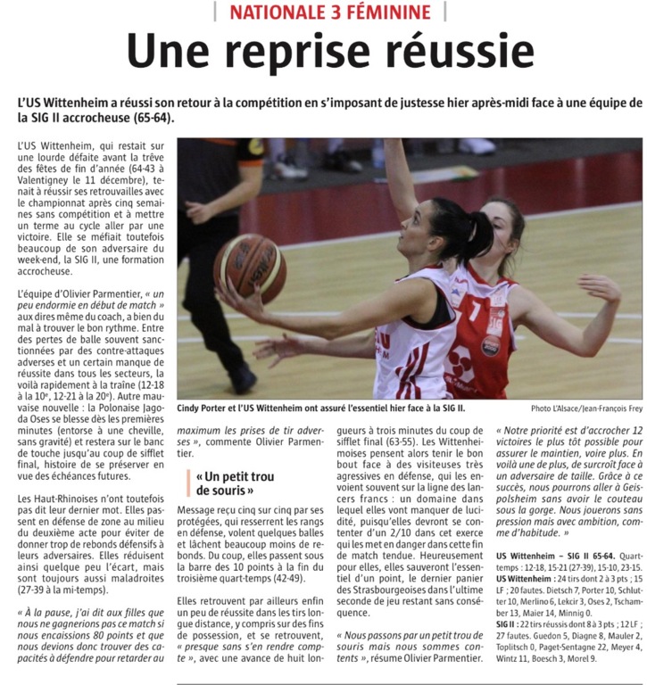 Découvrez l'article de Sandrine Pays paru ce lundi dans l'Alsace sur la courte, mais non moins précieuse, victoire de nos filles face à la SIG