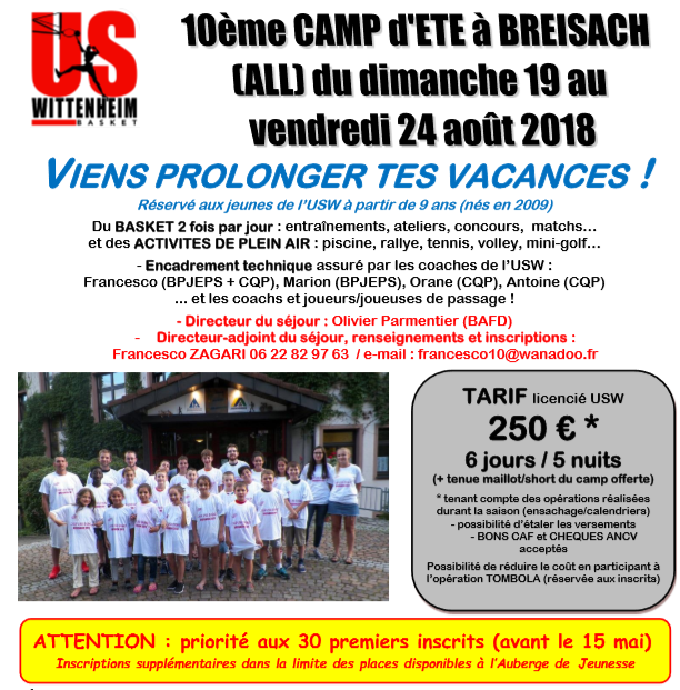Cet été aura lieu du 19 au 24 août le 10 ème camp d'été à Breisach ! Alors viens prolonger tes vacances et recommencer la saison de la meilleure des façons ! Au programme, une reprise basket plutôt ludique, activités de plein air, veillées à thème...