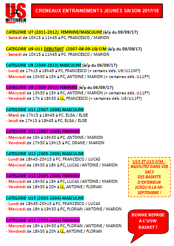 Voici les créneaux d'entrainements définitifs pour toutes les catégories jeunes de l'USW pour la saison 2017/2018 :