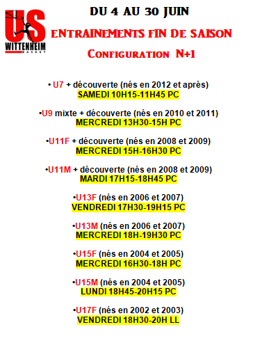 Voici les entrainements du mois de juin pour les jeunes de l'USW! Les entrainements sont réduits à un par semaine et par équipe en cette fin de saison et s'effectuent selon les catégories dans lesquelles les joueurs évolueront la saison prochaine !